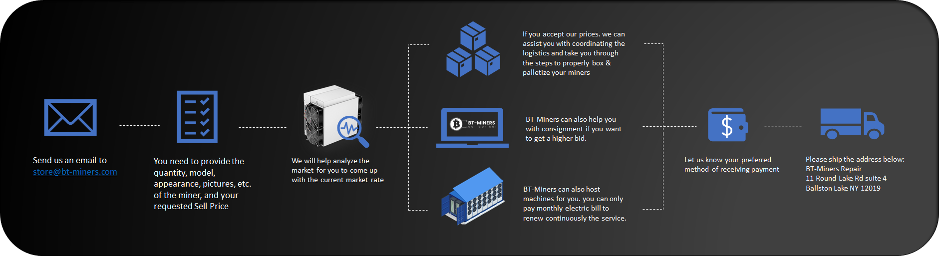 A BT-Miners representative will reply back to your sell request to confirm the details and help orchestrate the sale. We look forward to working with you and let us do the heavy lifting!!!